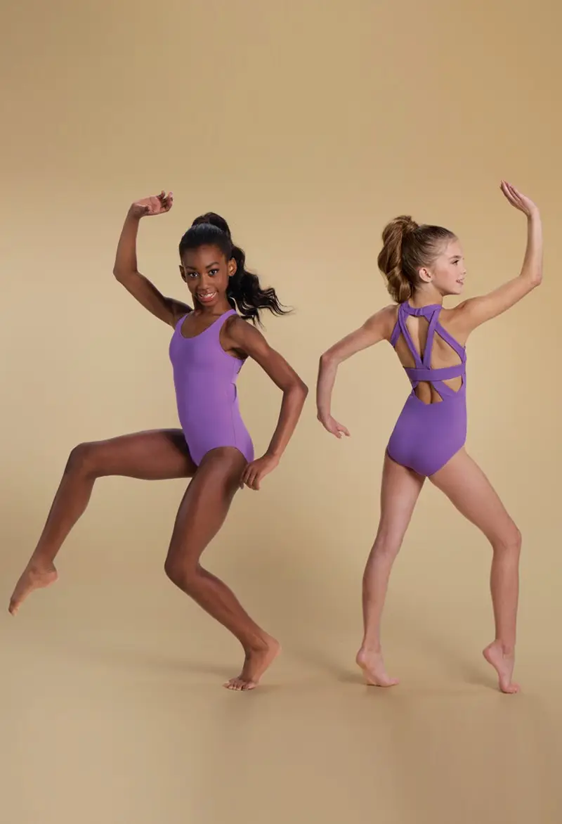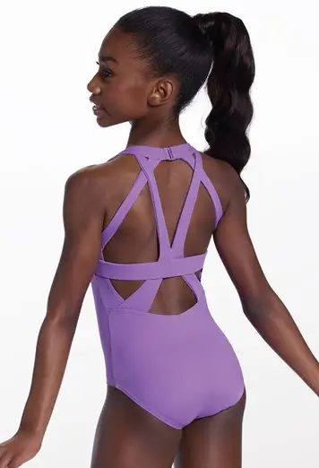 A young girl with a high ponytail is shown from the back, wearing the Strappy Cutout Halter Leotard in purple, featuring multiple straps and geometric cutout details.